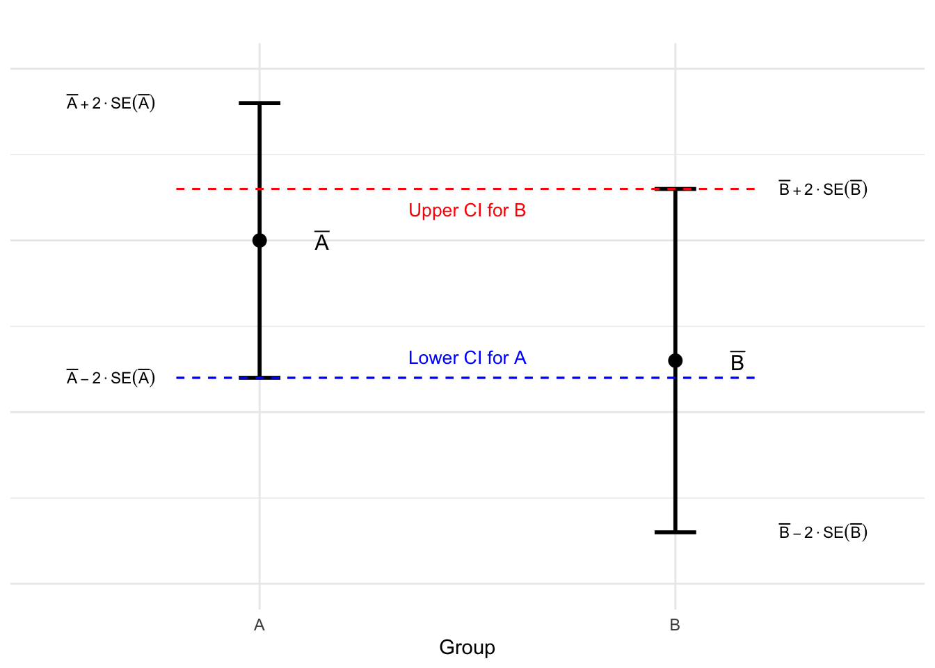 - Overlapping CIs: \((\bar{A} - \bar{B})/z < \text{SE}(\bar{A}) + \text{SE}(\bar{B})\)