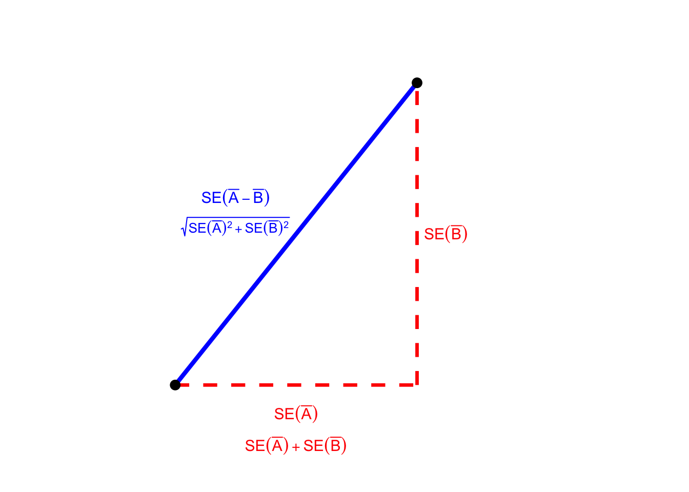 So how do these two facts help us? Consider a right triangle whose legs have lengths \(\text{SE}(\bar{A})\) and \(\text{SE}(\bar{B})\). By the Pythagorean Theorem, the hypotenuse of this triangle has length \[\sqrt{\text{SE}(\bar{A})^2 + \text{SE}(\bar{B})^2} = \text{SE}(\bar{A} - \bar{B}) \] and by the triangle inequality, we have: \[\text{SE}(\bar{A} - \bar{B}) < \text{SE}(\bar{A}) + \text{SE}(\bar{B}).\] We can read this inequality from the following figure: travelling along the dashed red path covers a distance of \(\text{SE}(\bar{A}) + \text{SE}(\bar{B})\), while travelling along the solid blue path the shorter distance of \(\text{SE}(\bar{A} - \bar{B})\).